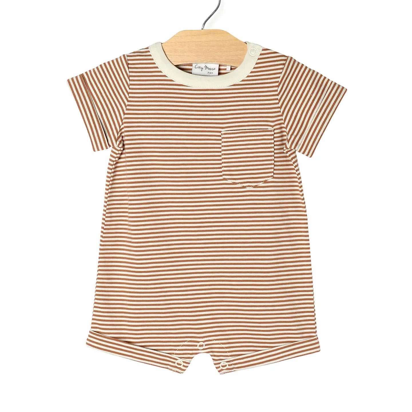 The classic short sleeve romper in our new toffee stripe is perfect for everywhere they want to go. In our 100% combed jersey cotton and with snaps at crotch and neck for easy changing.