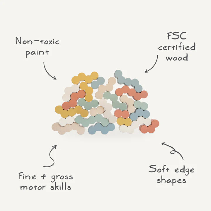 Designed with a delightful rounded bubble shape, our wooden balance blocks add a playful twist to traditional stacking toys. Crafted from smooth, FSC-certified wood and painted in calming colors with non-toxic paint, these blocks are perfect for nurturing creativity and fine motor skills. The gentle curves and soft hues invite little hands to explore, balance, and build.