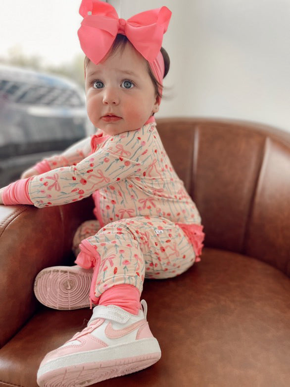 Embrace the season of love and blossoms with our Blooms & Bows Dream Ruffle Romper! Adorned with dainty flowers and charming bows, this delightful piece will wrap your little one in sweetness for Valentine’s festivities and beyond. Soft ruffle detailing adds the perfect touch of whimsical romance, making every twirl and cuddle feel extra special.