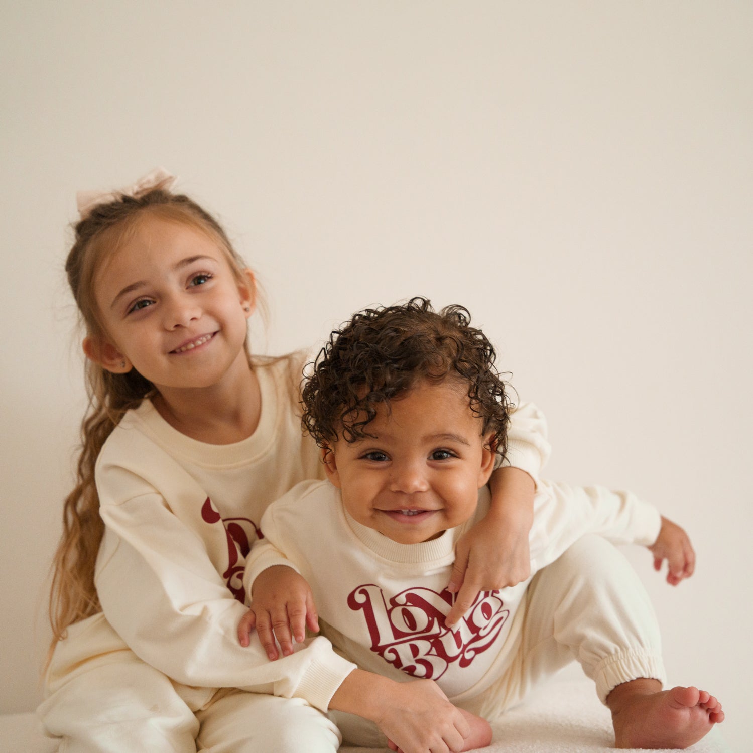 Dress your little Love Bug in our adorable cotton sweater, a perfect blend of charm and comfort. Made from 100% cotton with a lightweight feel, it's ideal for layering or standalone wear. The front boasts a playful 'Love Bug' script, while the back surprises with an embroidered ladybug, adding a pop of whimsy to this sweet piece. Delightfully soft and breathable, the Love Bug Crewneck is a lovable addition to your baby's wardrobe.