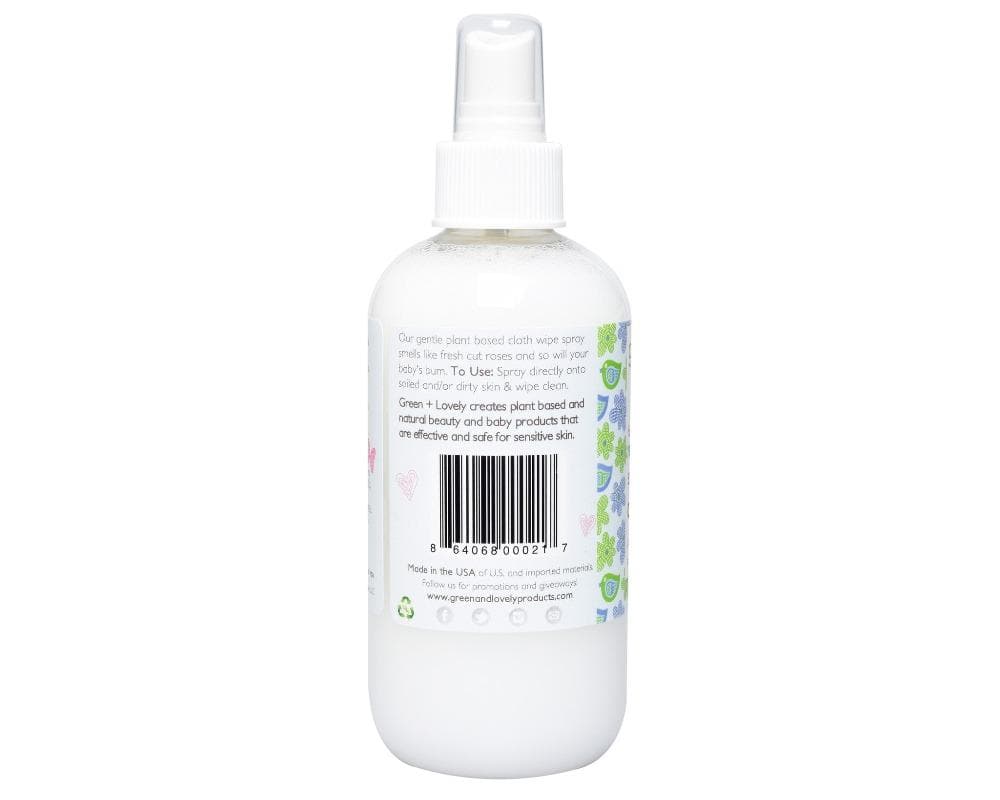 Smell the Roses Natural Cloth Wipe Spray is stored in a clear recyclable 9 oz recyclable bottle with a white spray nozzle and seal tight cap.