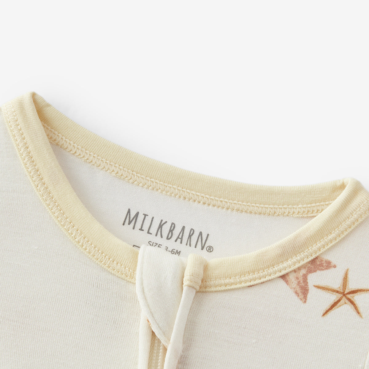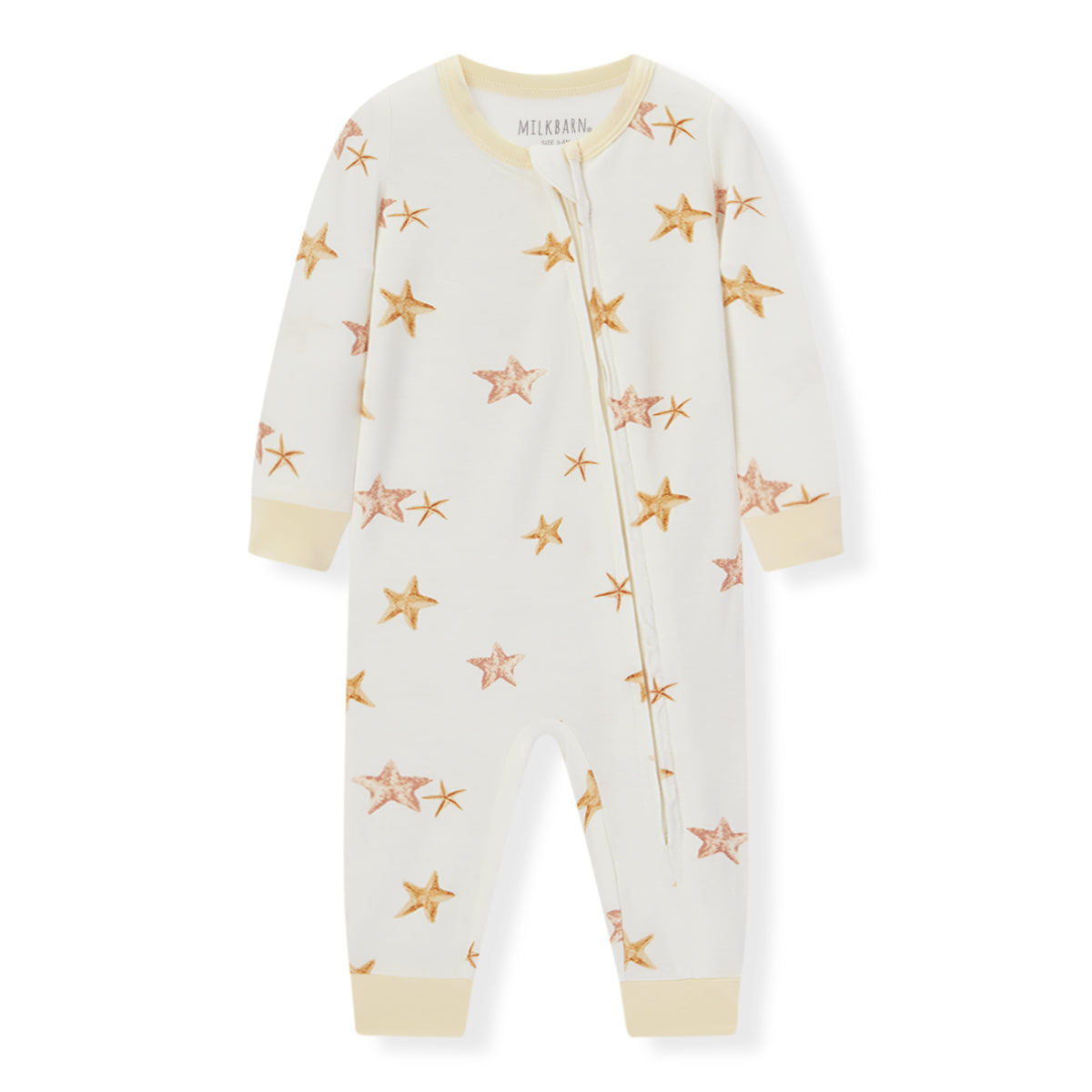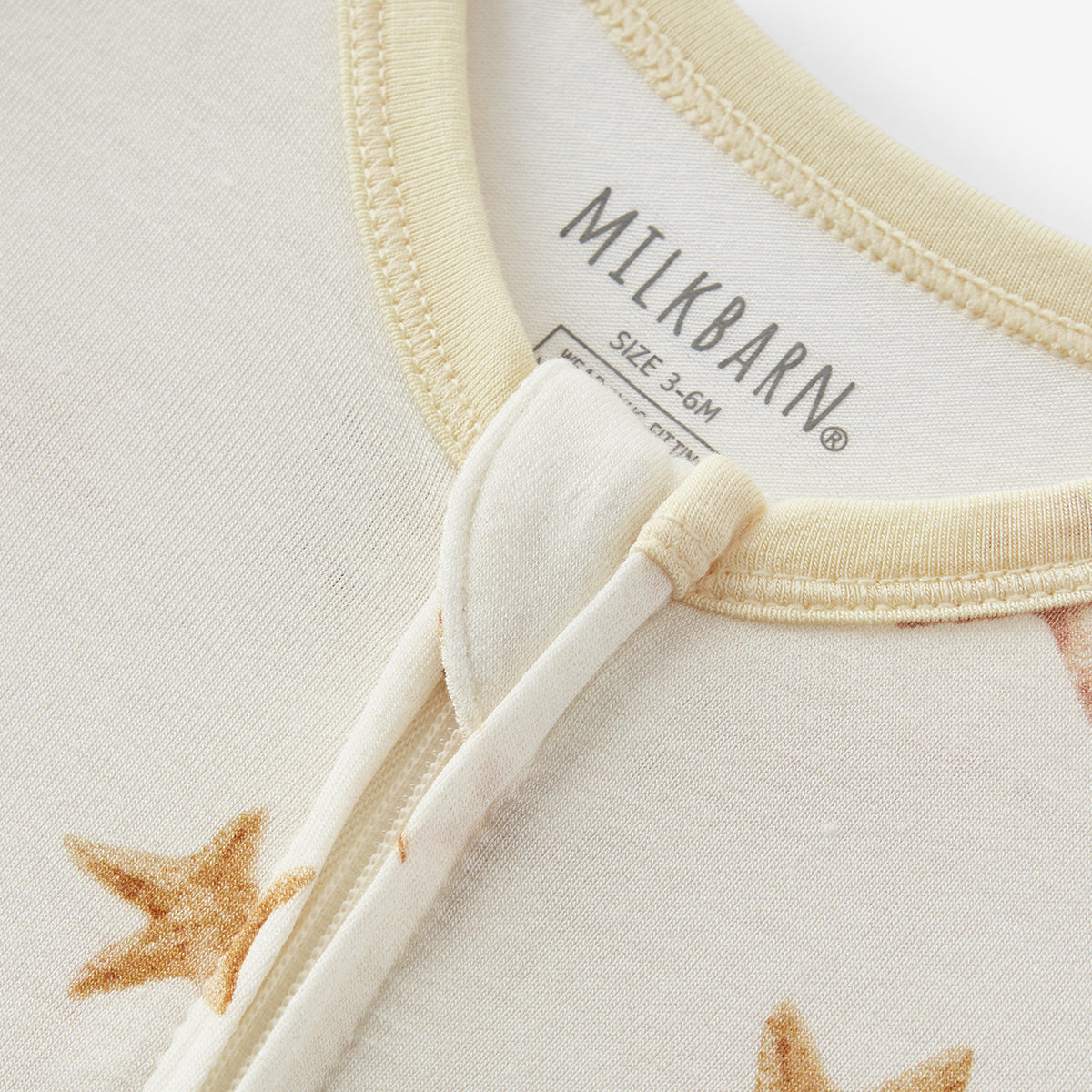 Our Luxe Stretch blend (95% rayon/viscose from bamboo, 5% spandex) feels silky-soft, breathable, and cool to the touch. A full-length zipper helps streamline cozy bedtimes and nap transitions for little ones. Inspired by sunny seaside adventures, our Starfish Dreams print adds an ocean-loving touch. Ideal for warm nights and summer naps.