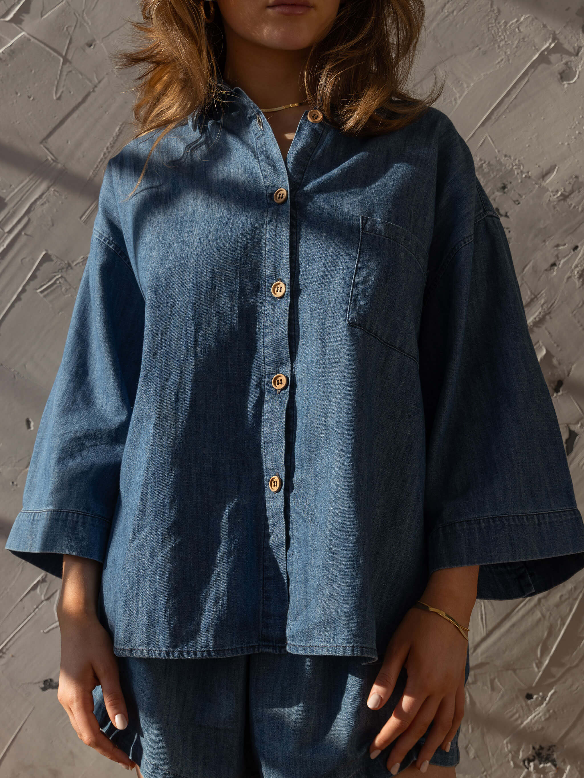 Meet our best-selling Linen Shirt, now in soft, denim chambray! This relaxed-fit button down-shirt for women has wide sleeves and a boxy fit that makes it the perfect everyday piece for the warm weather. We love it paired with The Chambray Denim Short or The Wide Leg Jean.