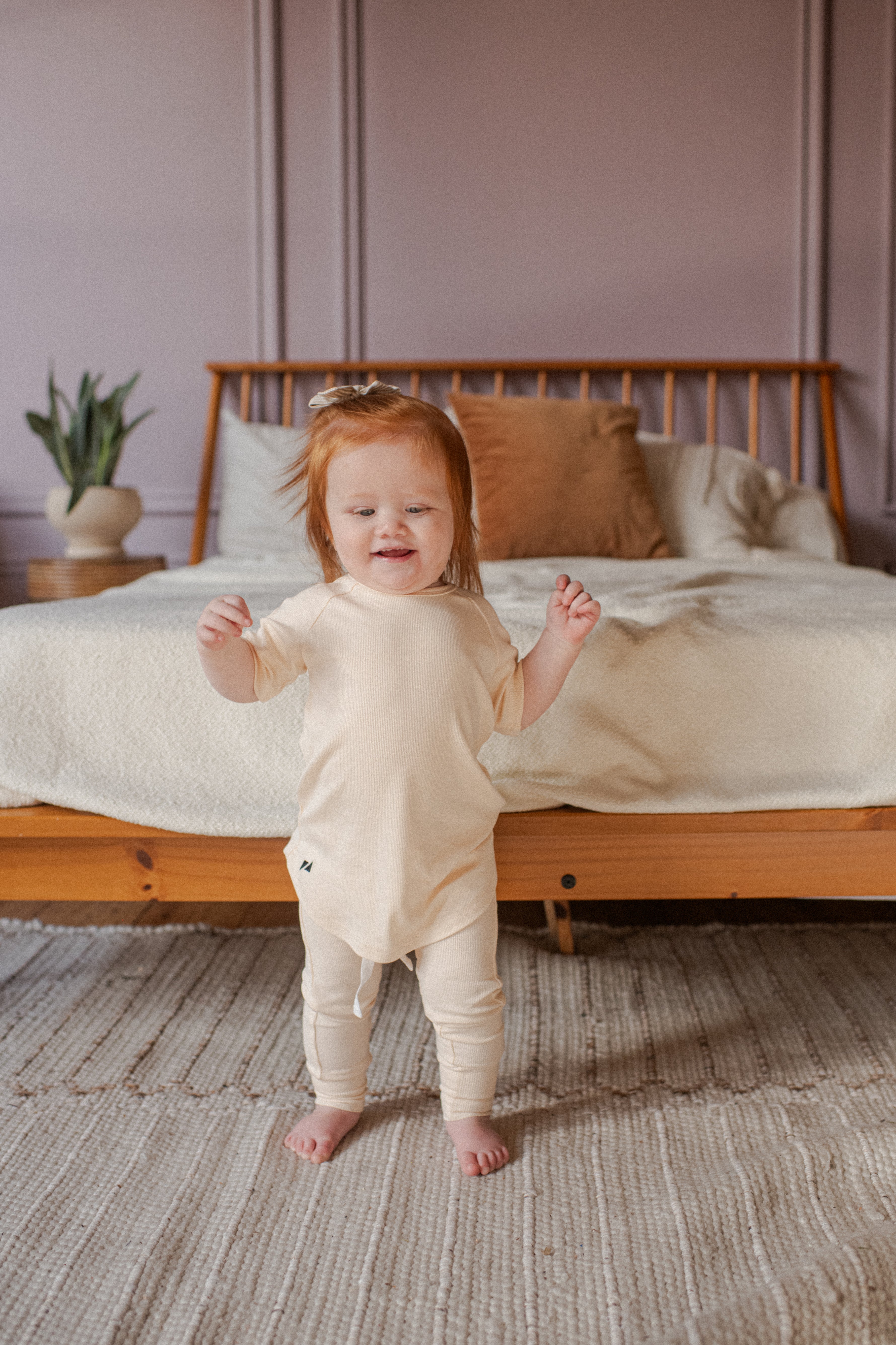 95% Modal 5% Spandex creates the perfectly soft, silky and buttery ribbed fabric that stretches and moves with your active little ones.  Buttery soft and stretch in all directions with  functioning draw string and an elastic waist are all part of these adorable pieces.