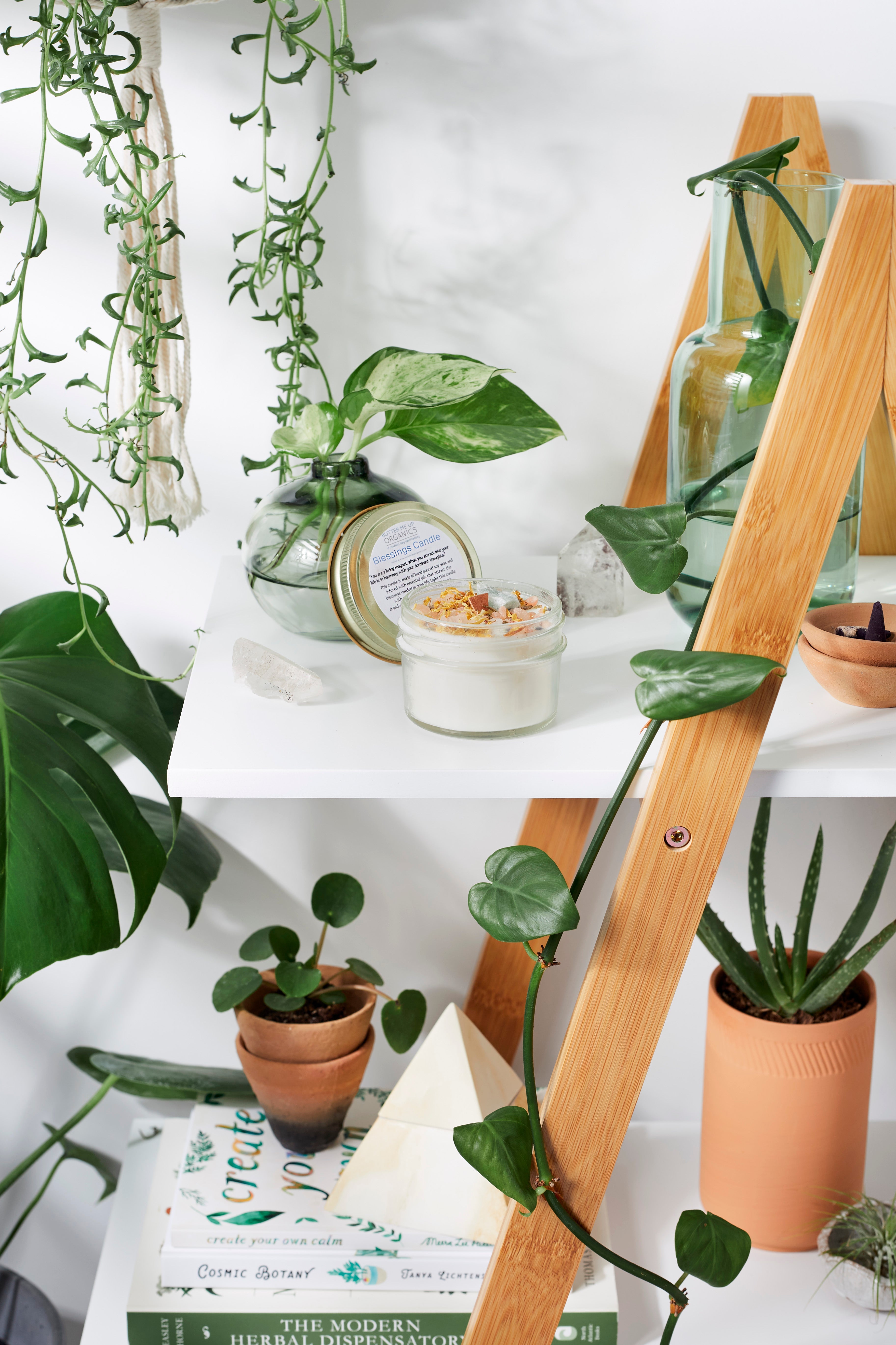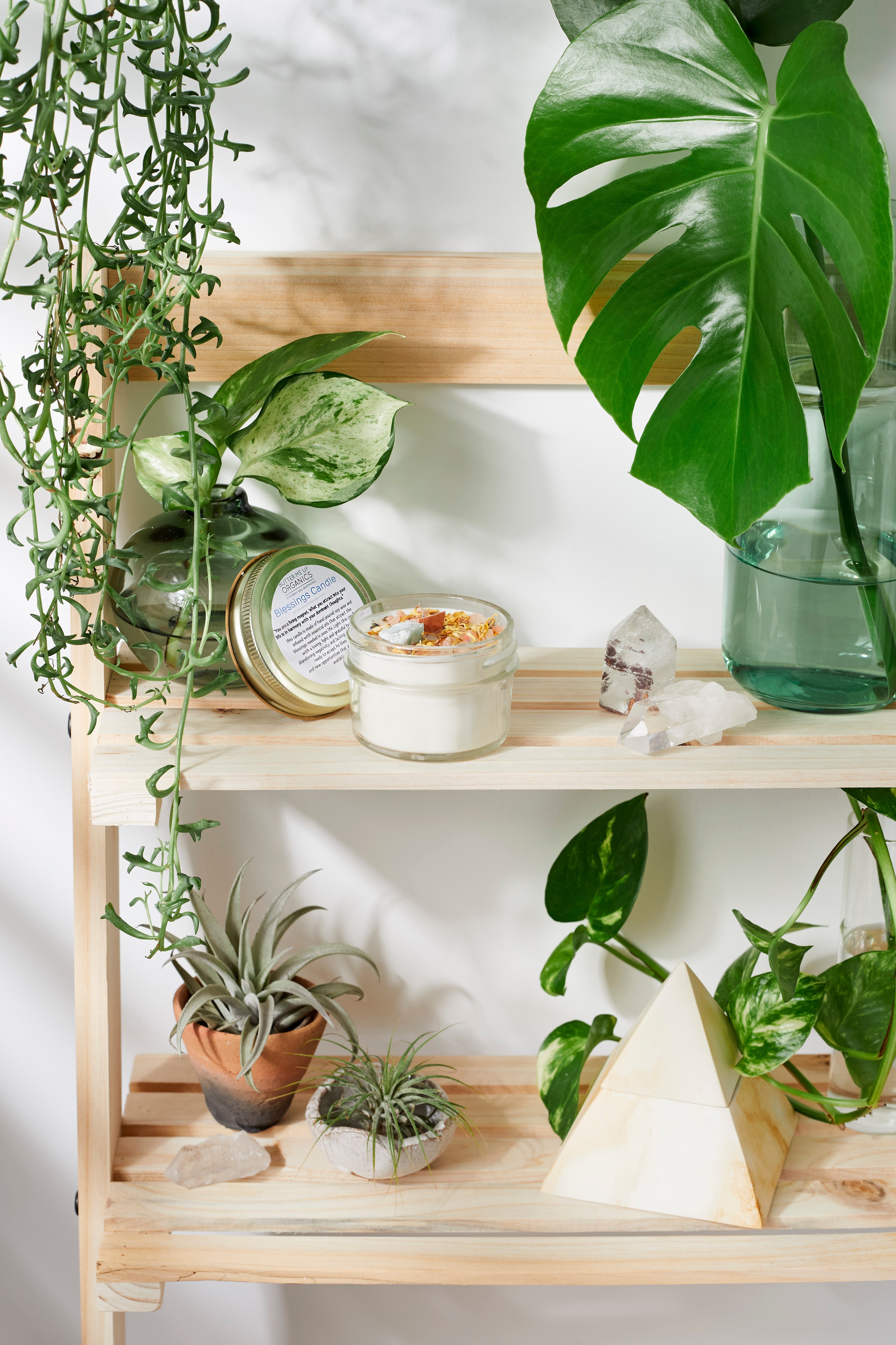 This intention candle is 4 oz of hand-poured soy wax in a glass jar with a metal lid. This candle has a wood wick and is infused with organic essential oils to promote happiness and blessings. We've topped it with calendula for regeneration, salt for purity, lavender for calm and a handpicked and charged green fluorite crystal. We chose Flourite as it is the most beneficial to the human brain. It is said to clear negative energy, promotes the higher self, and draws in more prana making one more available to blessings.