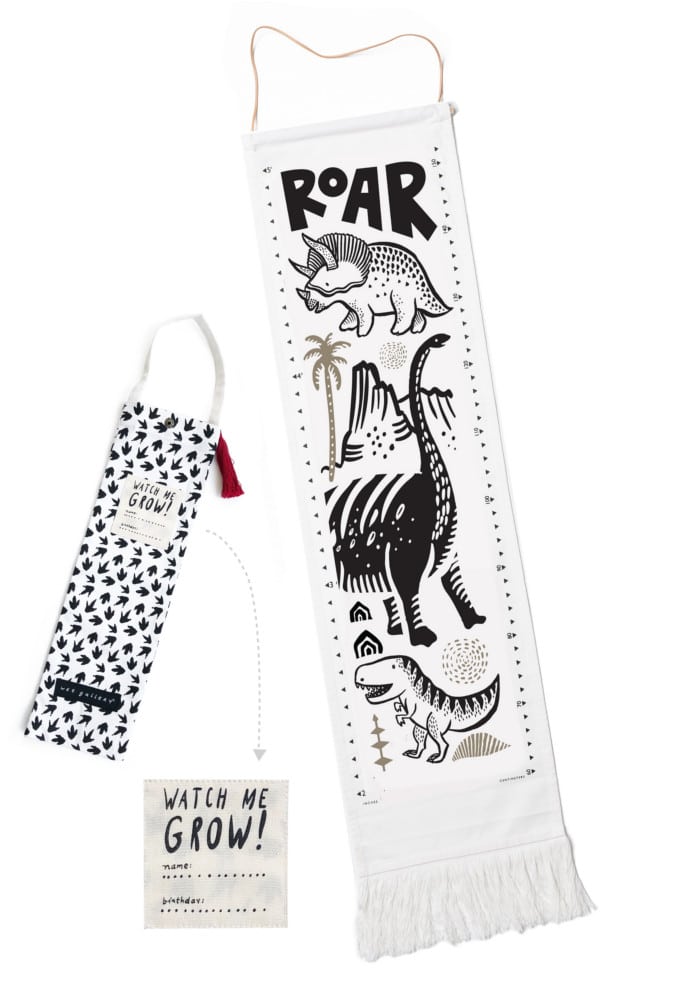 This organic cotton fabric Growth Chart features amazing dinosaurs that smile as your little one grows. The natural materials and lovely illustrations make it perfect wall tapestry accent to a stylish nursery, bedroom, or play room decor. Easily mount on a hook or nail, the twine makes it easy to move when needed.