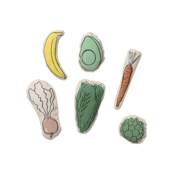 Perfect for imaginative play, our farmers market tote is a great size for little hands and includes 6 hand sewn fruits + veggies. Sewn and screen printed by hand on natural canvas by local artisans.