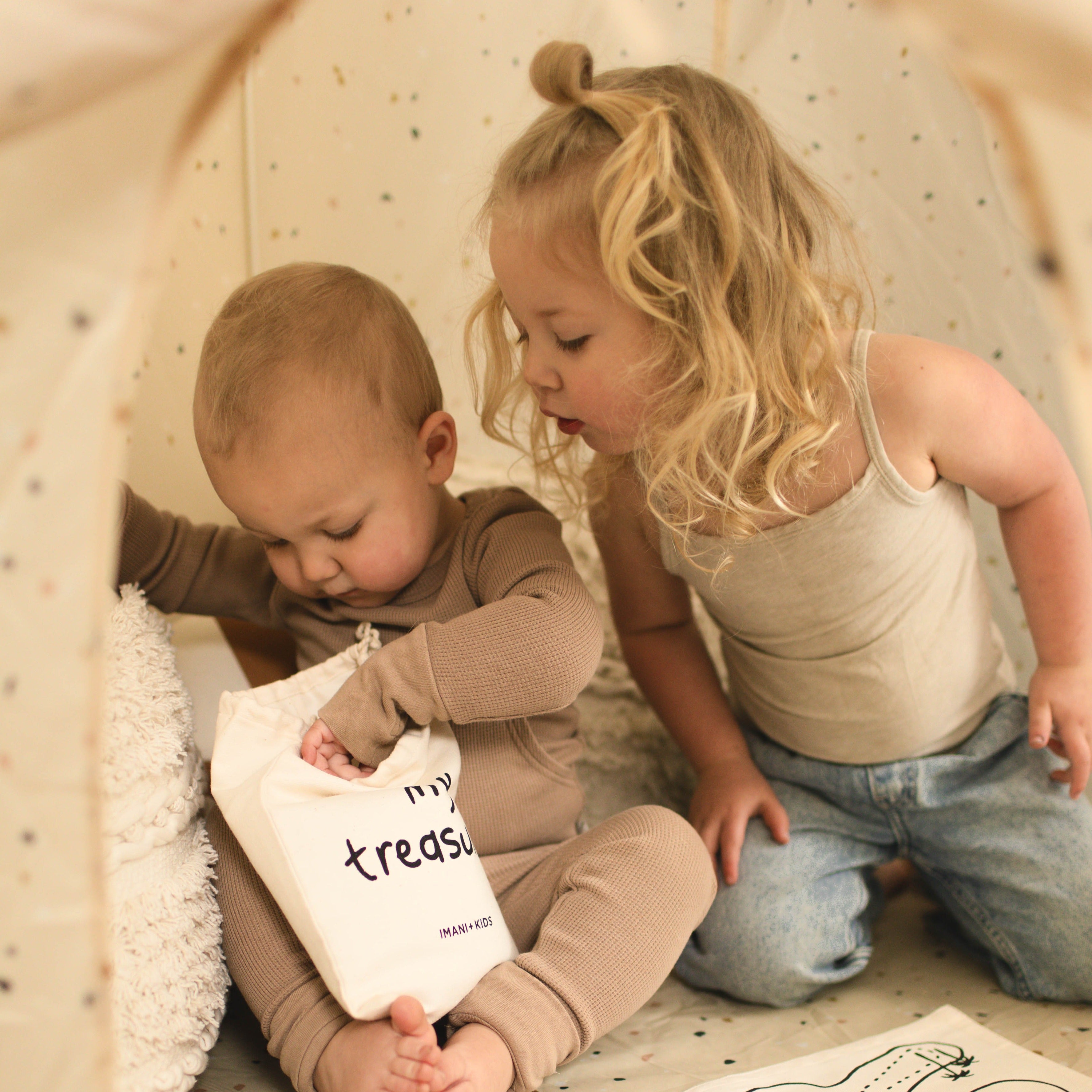 Elevate your child's playtime with the Imani + Kids Treasure Drawstring. It not only serves as a practical tool for carrying the day's discoveries but also as a beautiful symbol of the endless possibilities that lie in open-ended play. With this drawstring, your children are not just collecting objects; they're gathering memories, crafting stories, and learning in the most natural way possible.