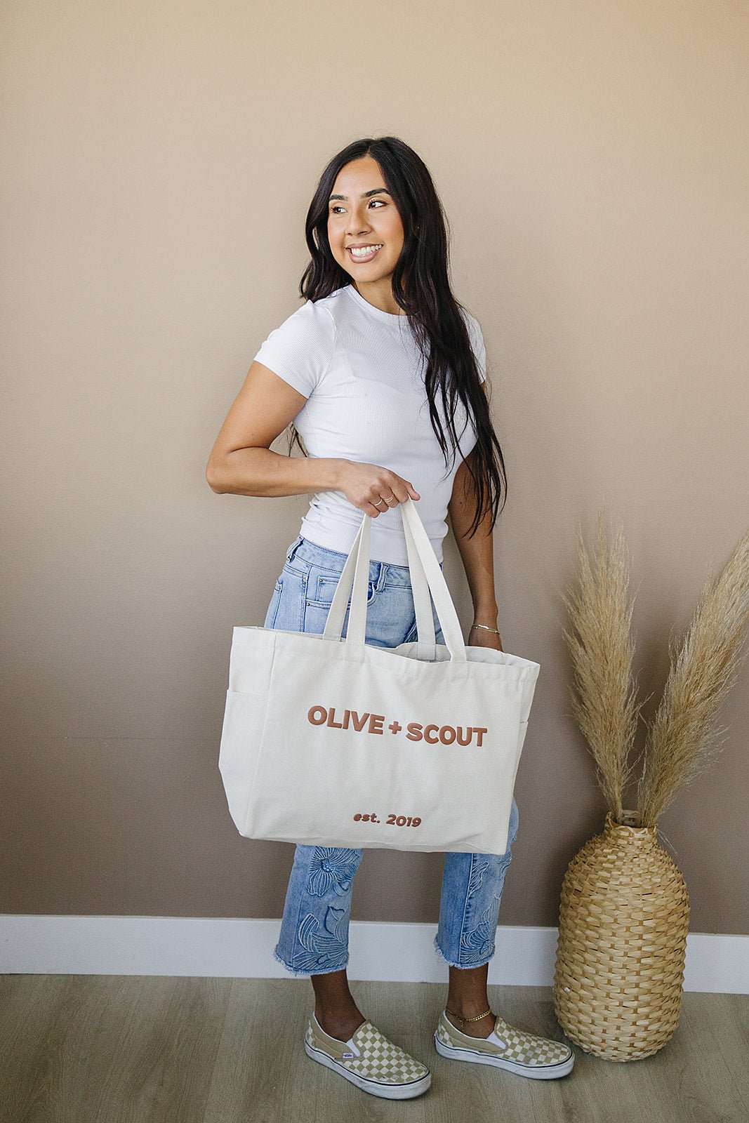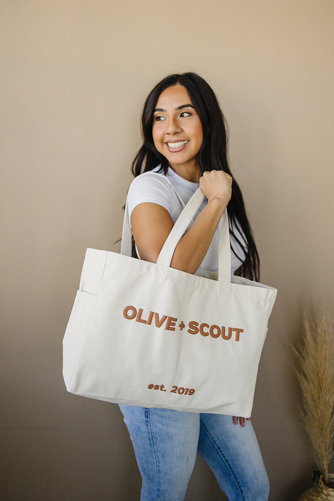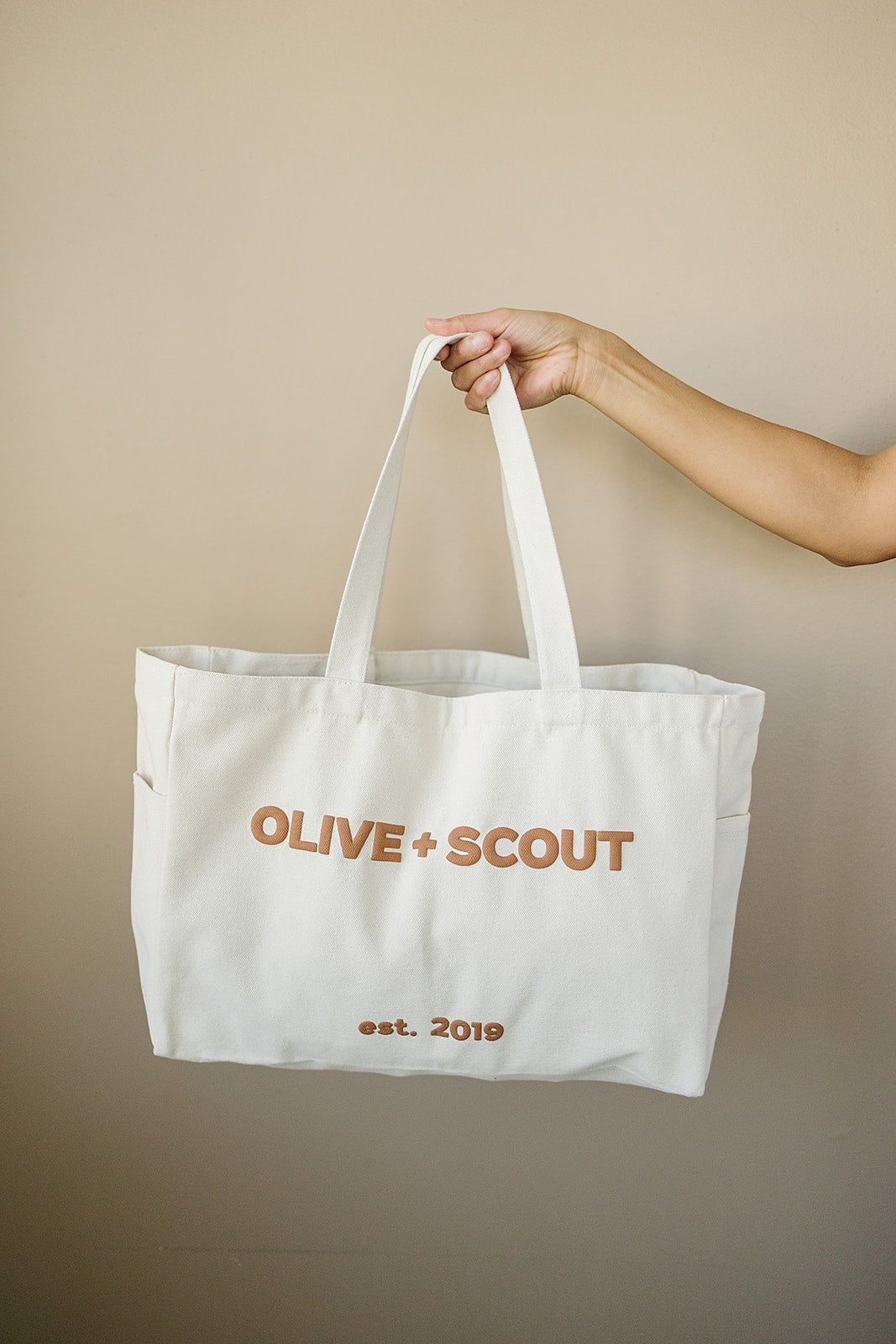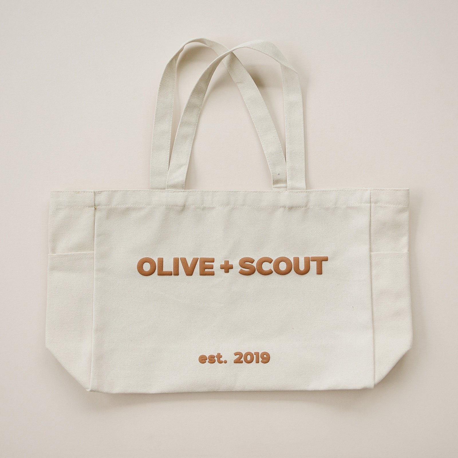 Introducing the O+S Tote, the perfect companion for those on-the-go adventures! With its durable canvas material and spacious interior, it can hold everything you and your little one need for a fun day out. Plus, its side pockets provide extra storage for all your essentials and an interior pocket for your keys or sunglasses. With simple puff print text on one side, this tote is practical and stylish! Measures 22 inches wide by 12.25 inches tall.