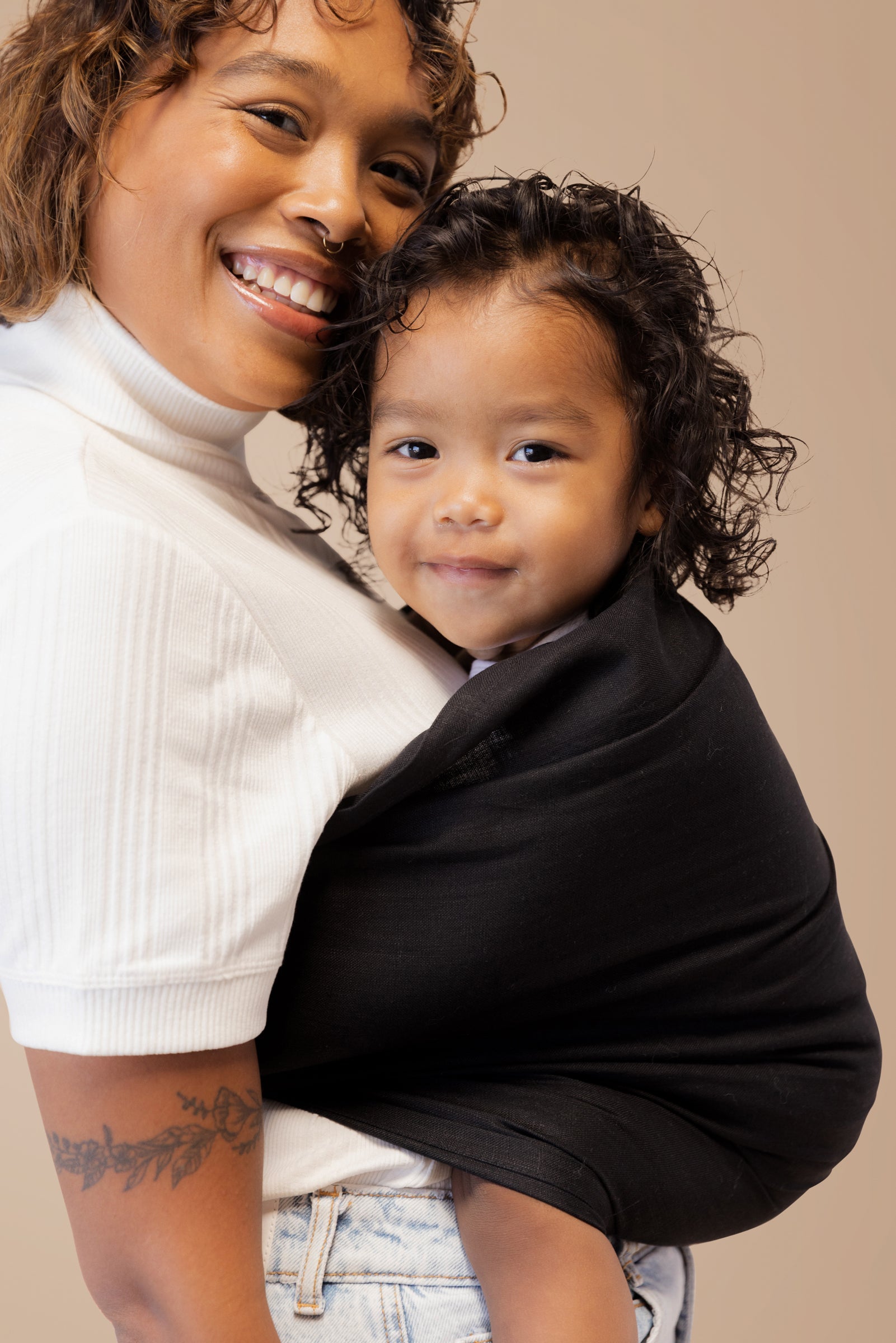 Our single-layer Raven sling is woven from inky jet black linen. Perfect for warm cuddles on a quiet, velvety night.