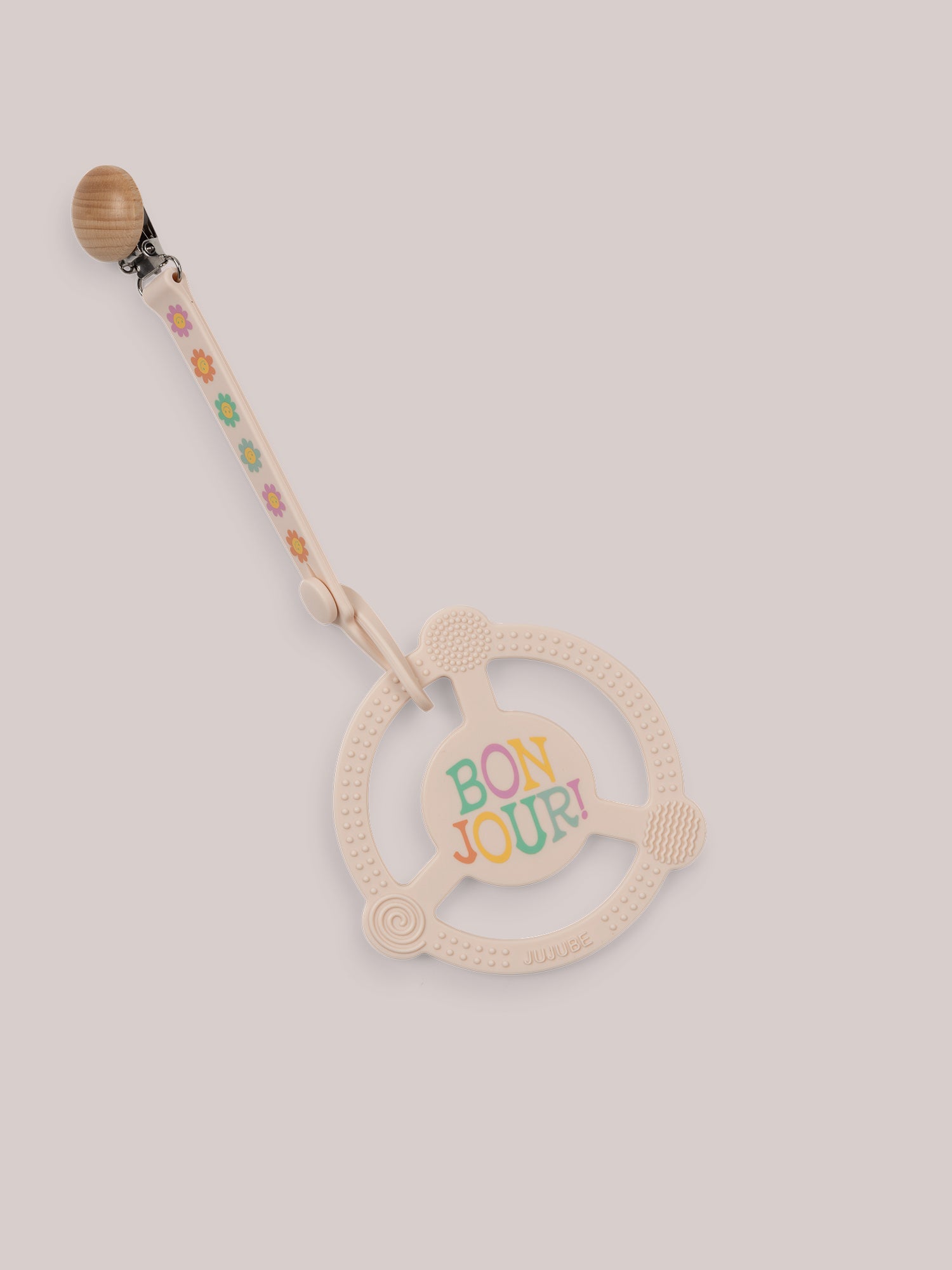 Help soothe your baby’s sore gums with the Silicone Teether Ring with Detachable Clip from JuJuBe x Studio Oh! This teether features an easy-to-grip design and three different massaging textures so Baby can choose what feels best. Place it in the freezer before use for additional cooling relief. This nontoxic, food-grade silicone teether is dishwasher-safe, and most importantly, it is BPA-free, PVC-free, phthalate-free, and lead-free, making it safe to go in Baby’s mouth. A snug-closing clip and silicone loop allow you to attach it to your baby’s clothes, bib, or wherever is convenient so you can keep track of the teether and keep it off the ground.