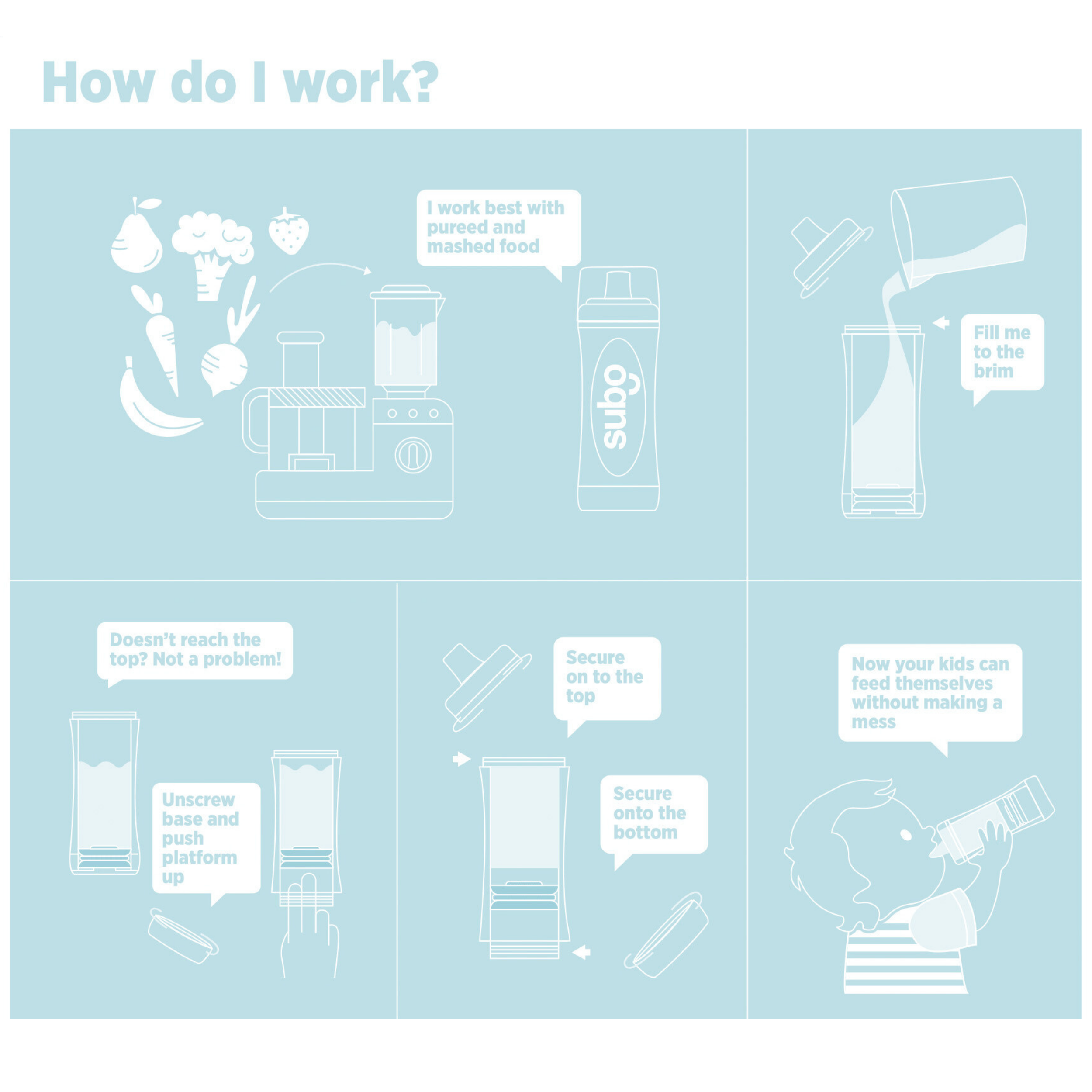 The Complete Starter set includes the Subo Baby Food Bottle as well as the 5mm Straw SpoutThe food bottle allows babies, toddlers and children to feed themselves independently. It is great for use on-the-go and works best with healthy homemade purees, smoothies, yogurts and mashed foods. When it comes to self-feeding, our baby food bottle is the perfect solution for both parents and children, creating a way for little ones to feed themselves without the potential of a big mess.